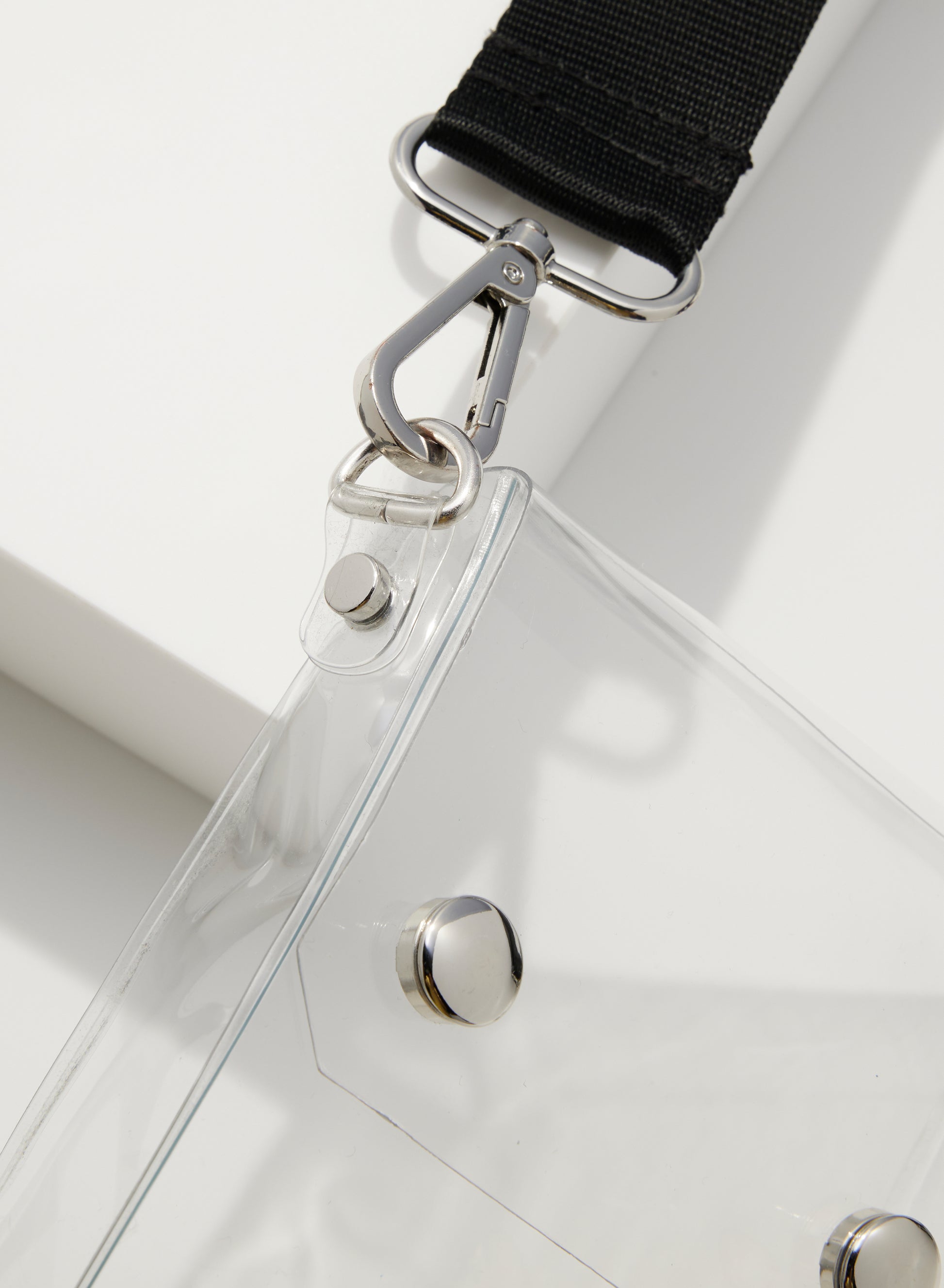 Transparent PVC cross body bag. Double magnetic button closure. Compact design. Detachable strap. Easy wipe clean.