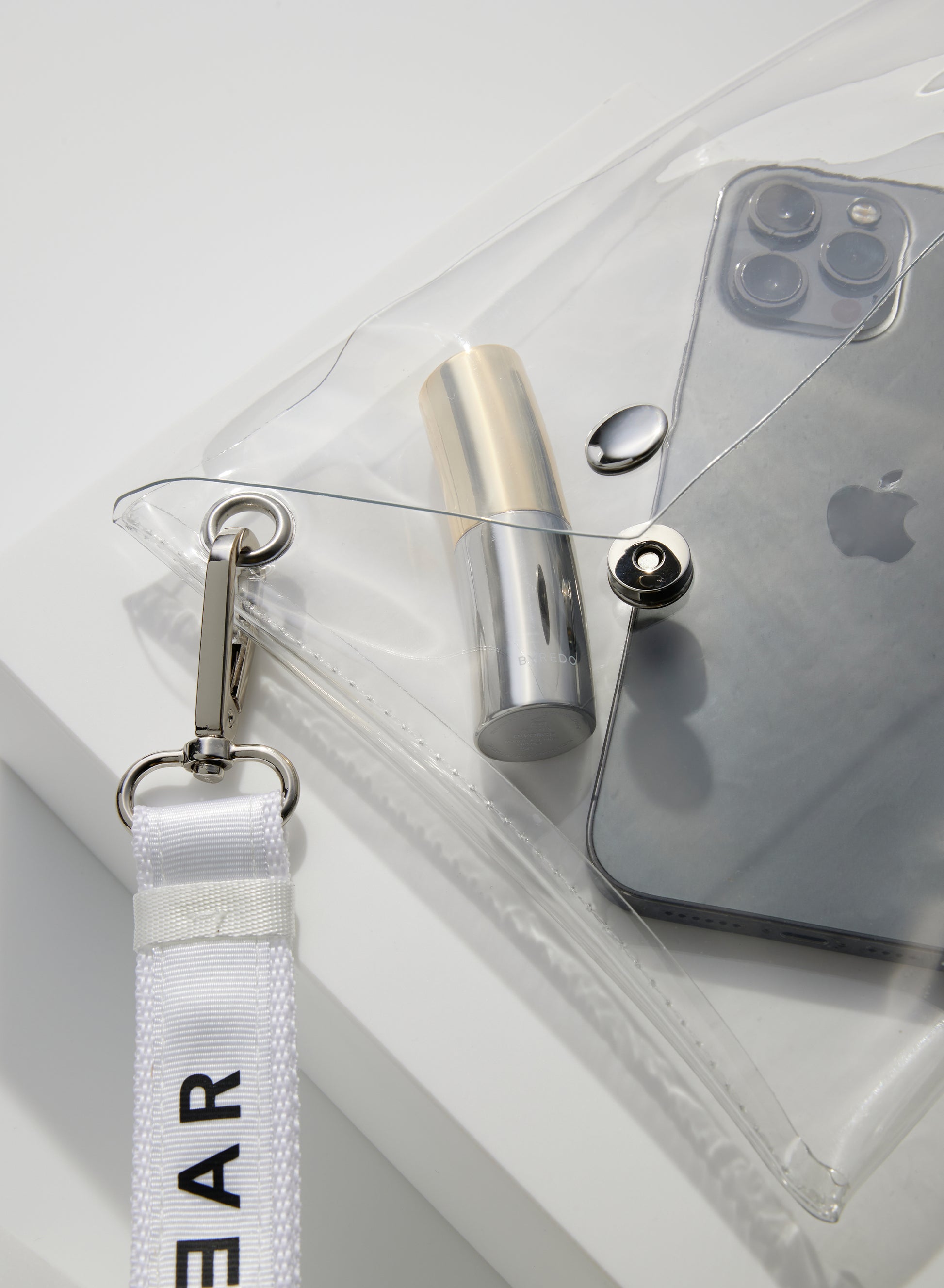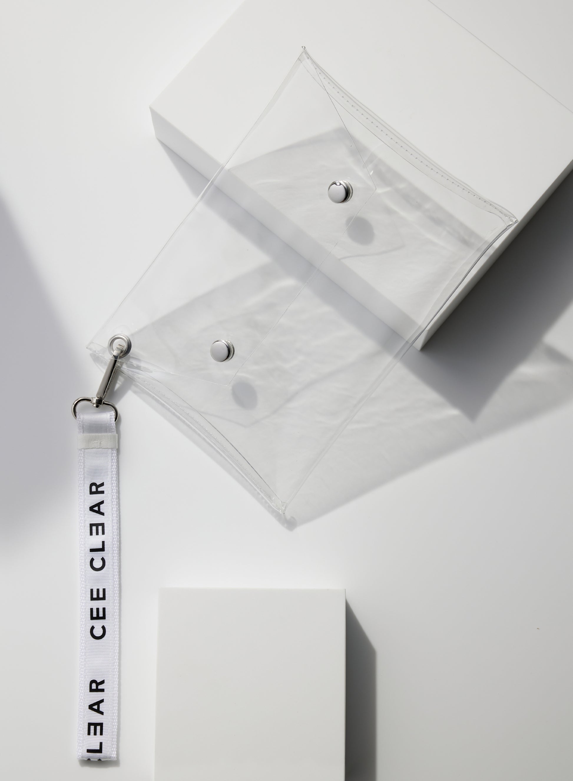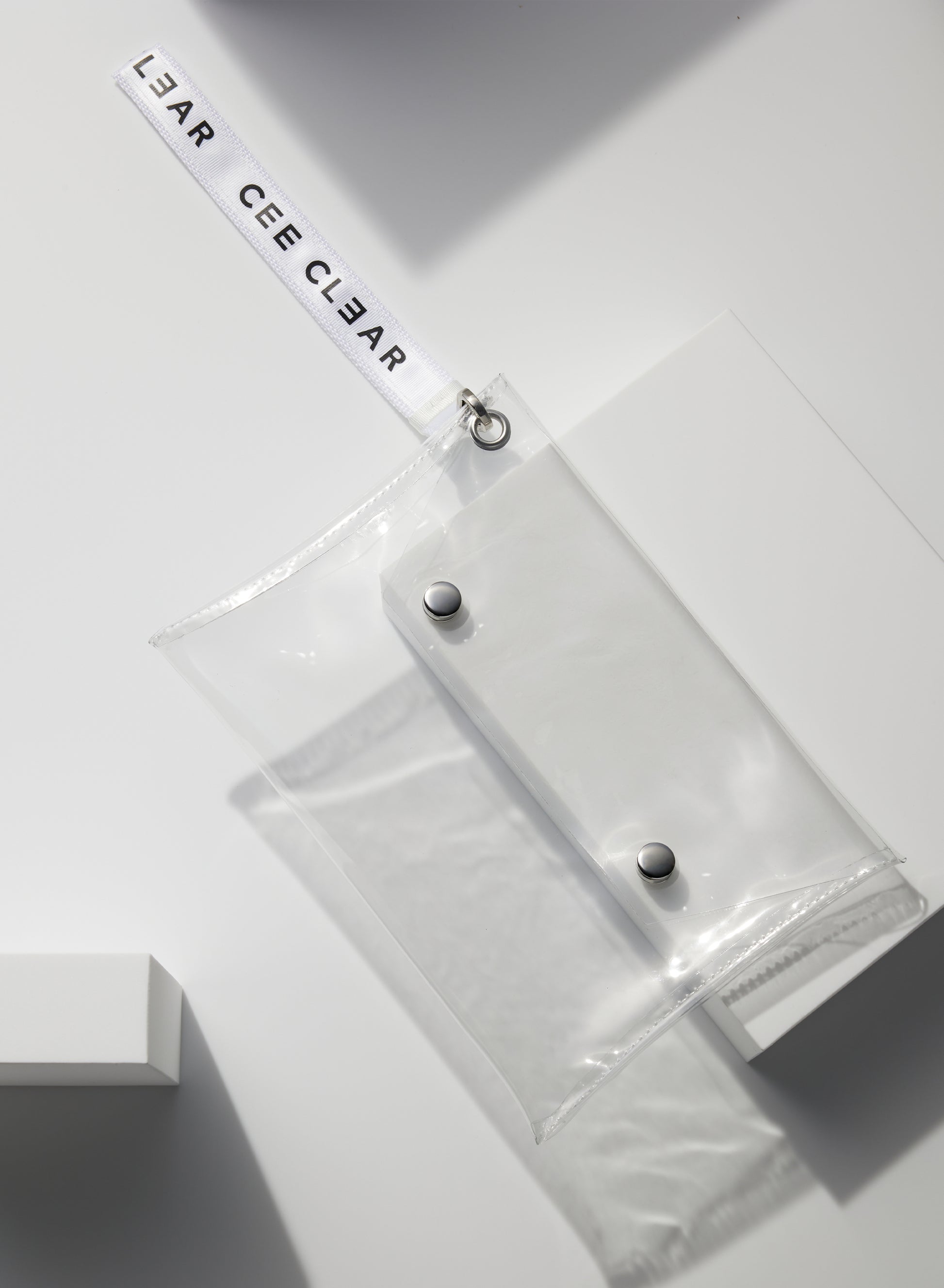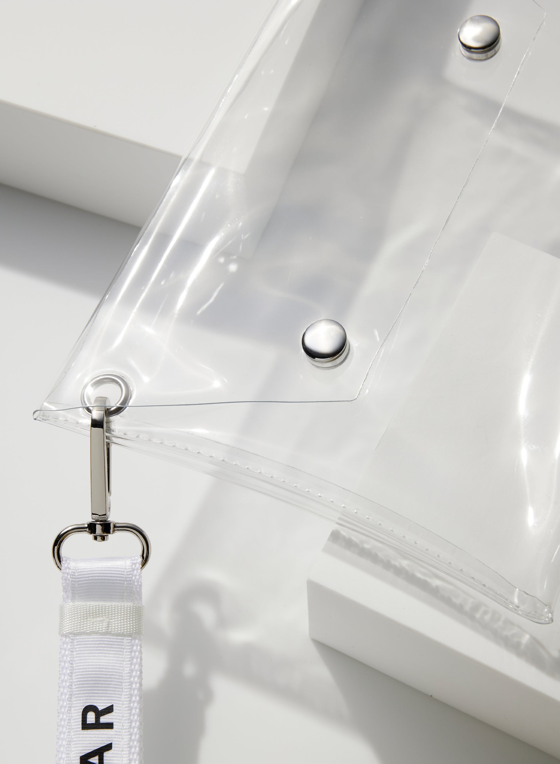 Transparent PVC purse. Double magnetic button closure. Detachable branded white wrist strap. Easy wipe clean.