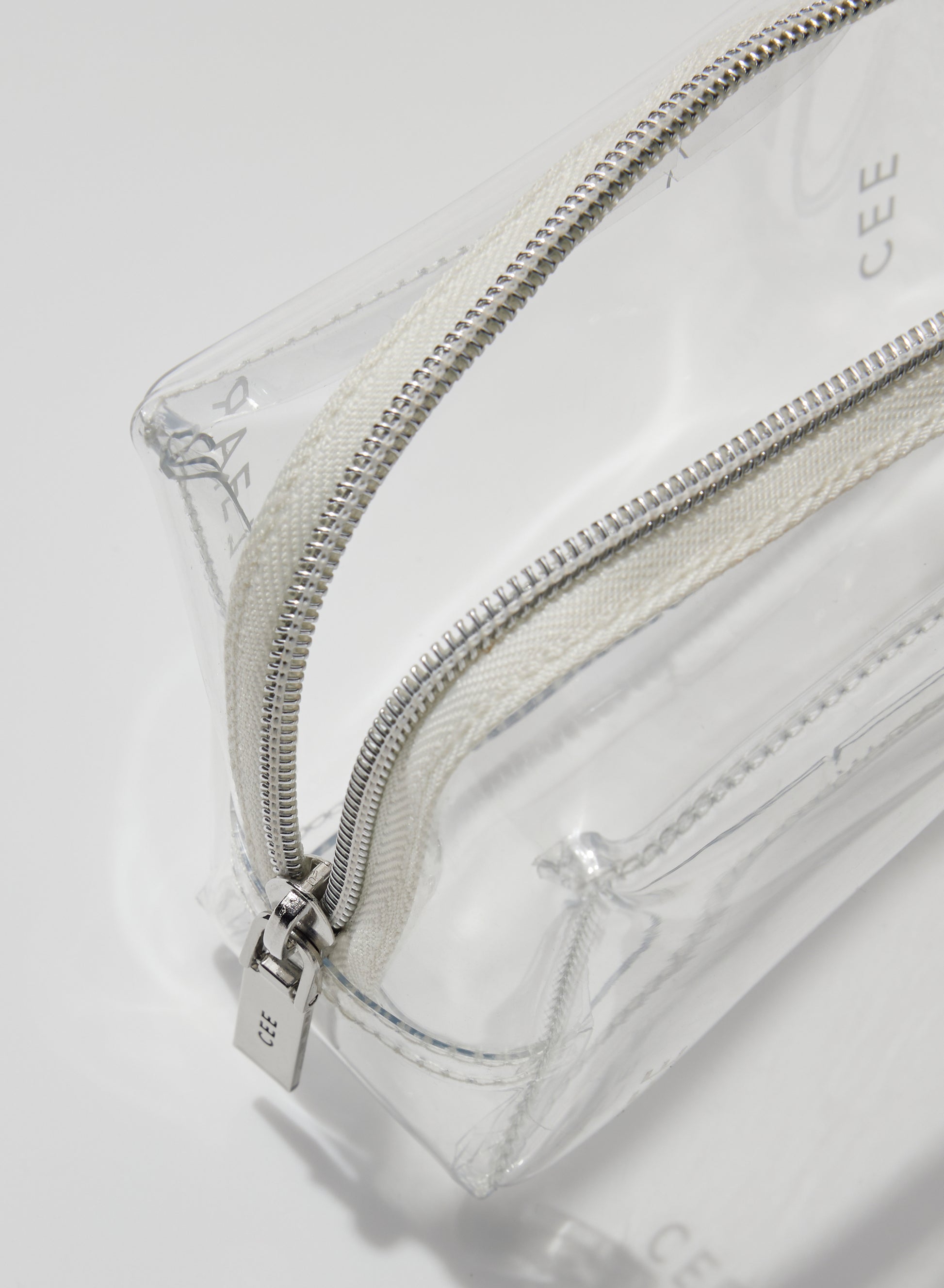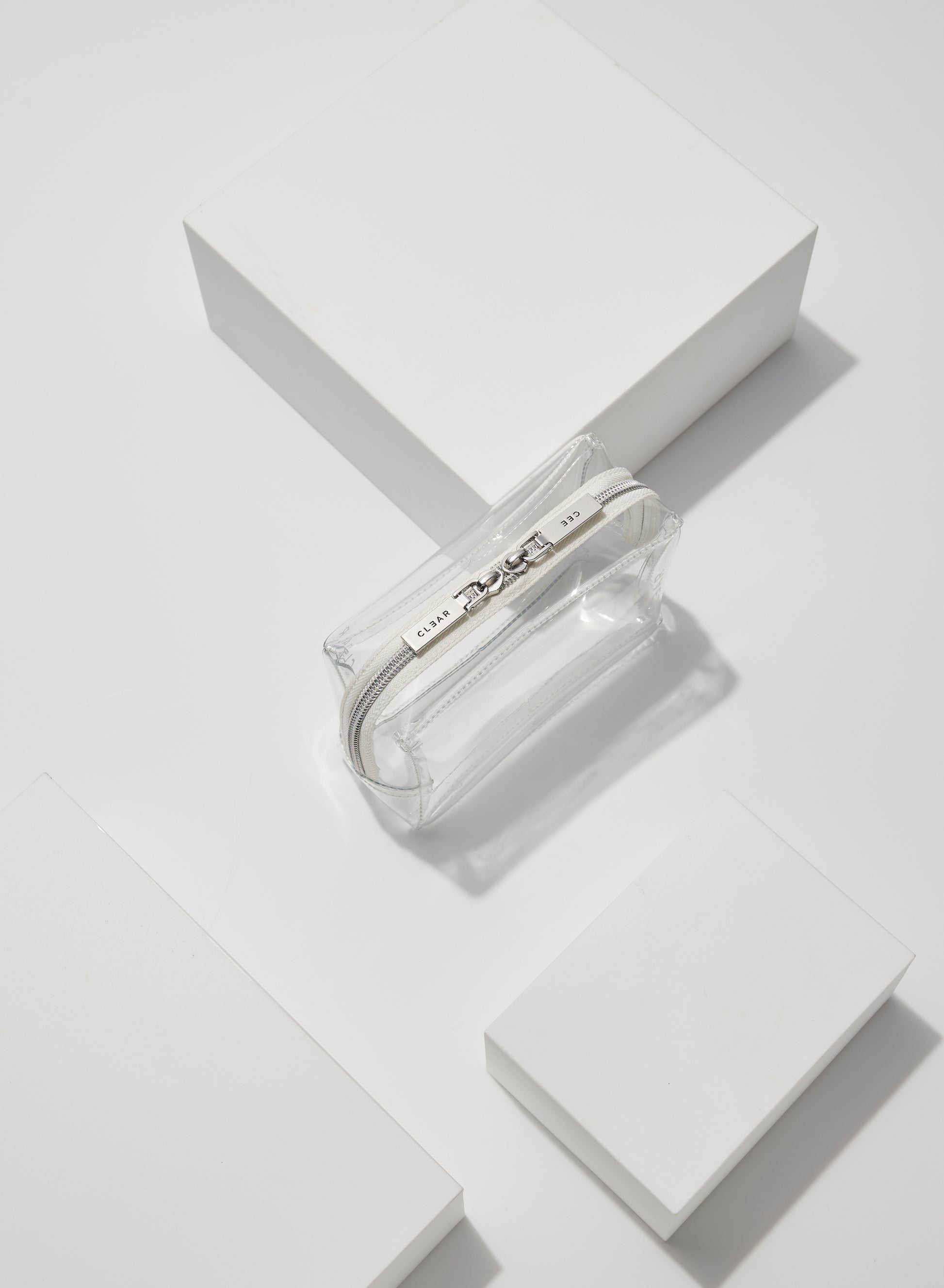 Mini PVC cosmetic case. White piping. Double zip closure. Clear stitched detail.