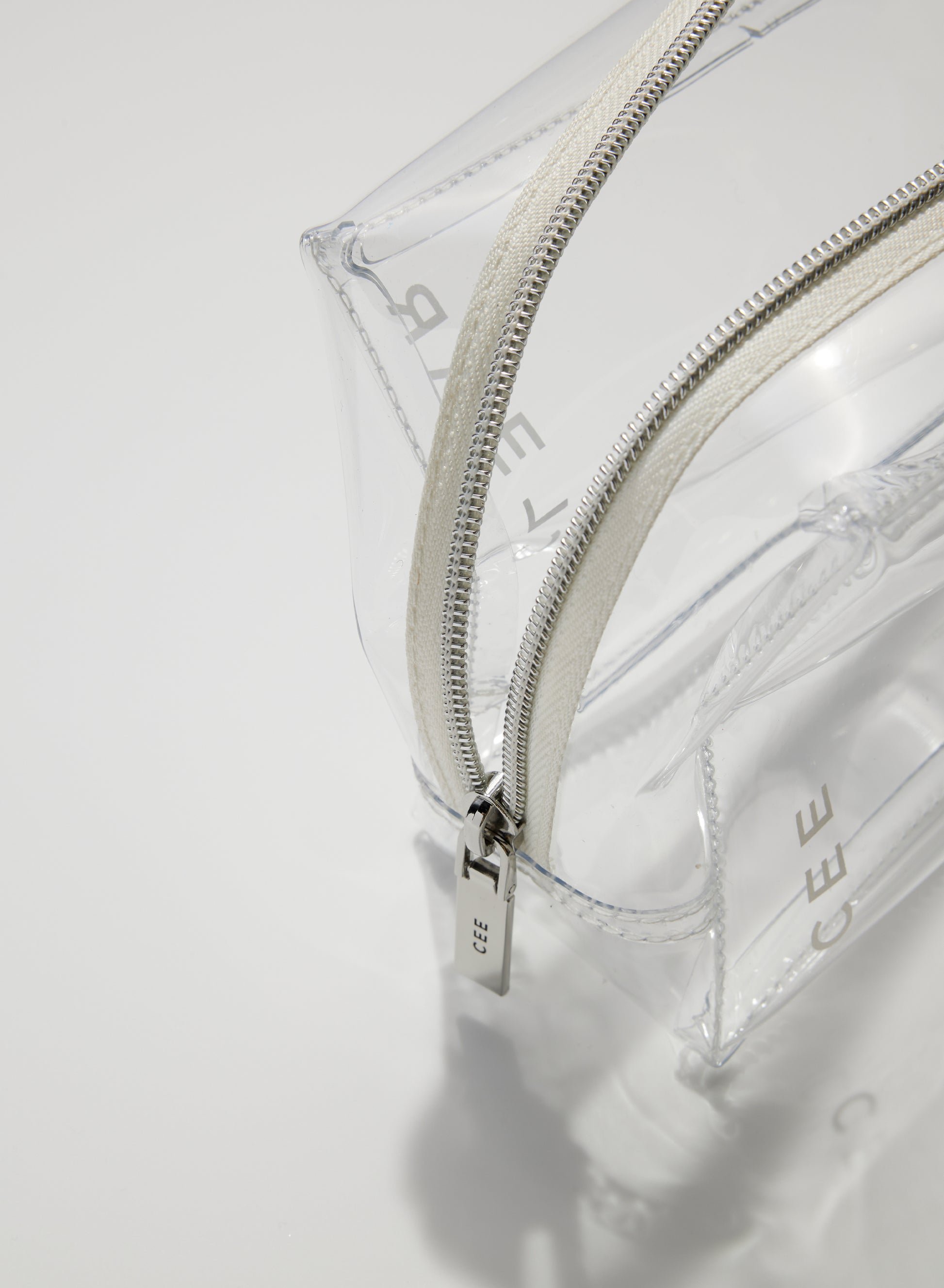 Small PVC cosmetic case. White piping. Double zip closure. Clear stitched detail.