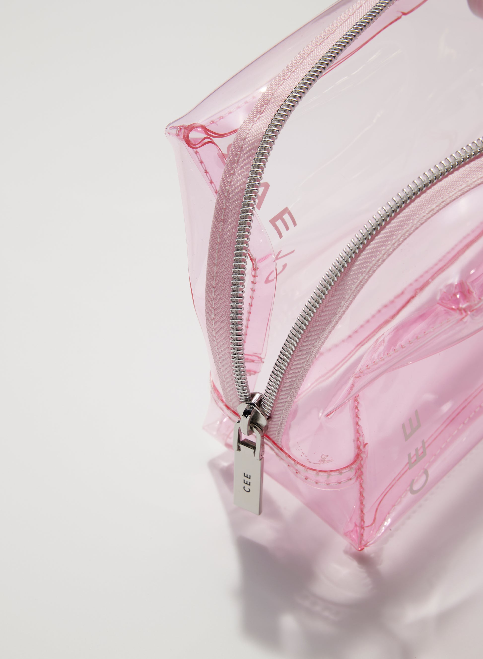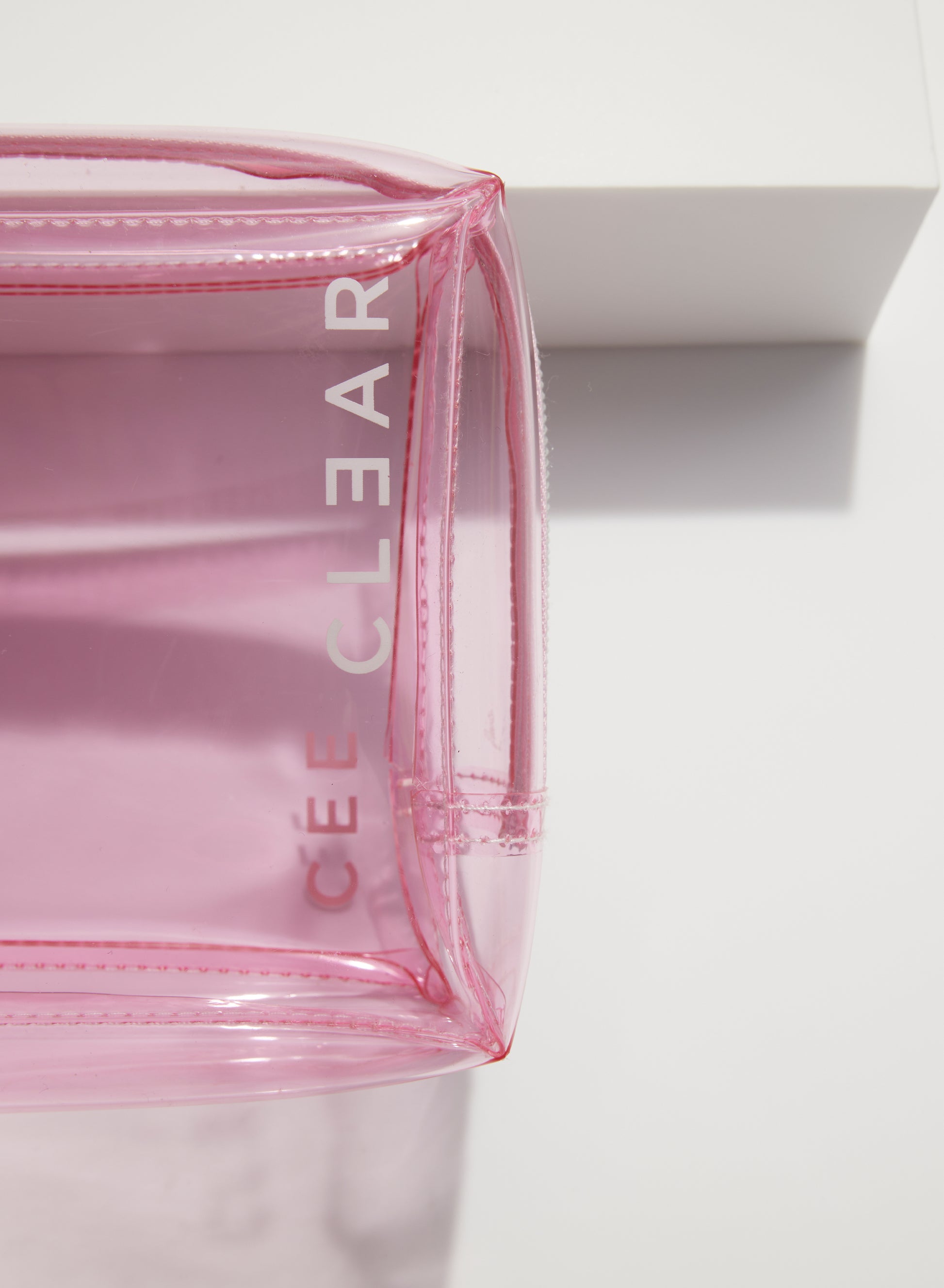 Small PVC cosmetic case. White piping. Double zip closure. Clear stitched detail.
