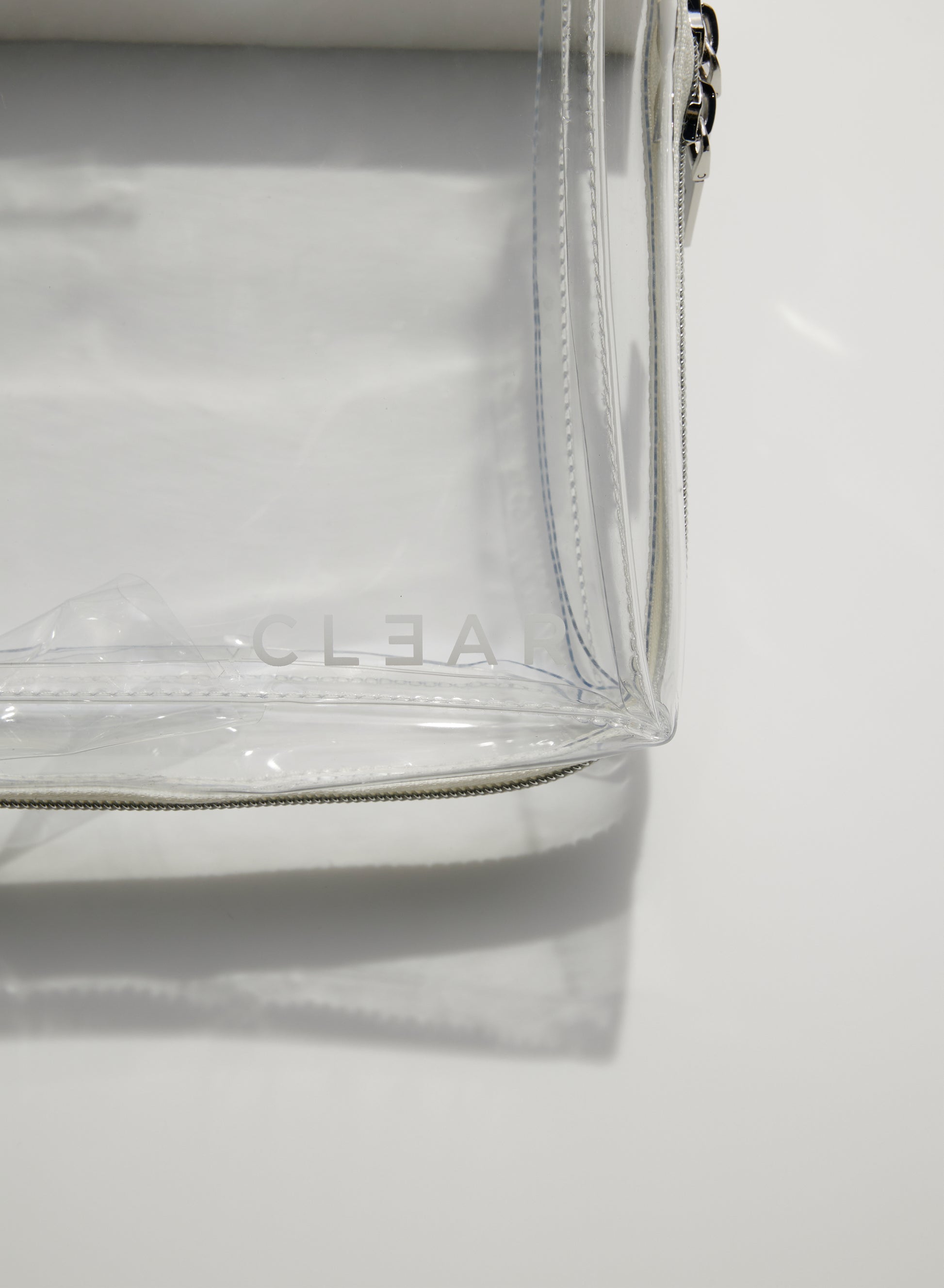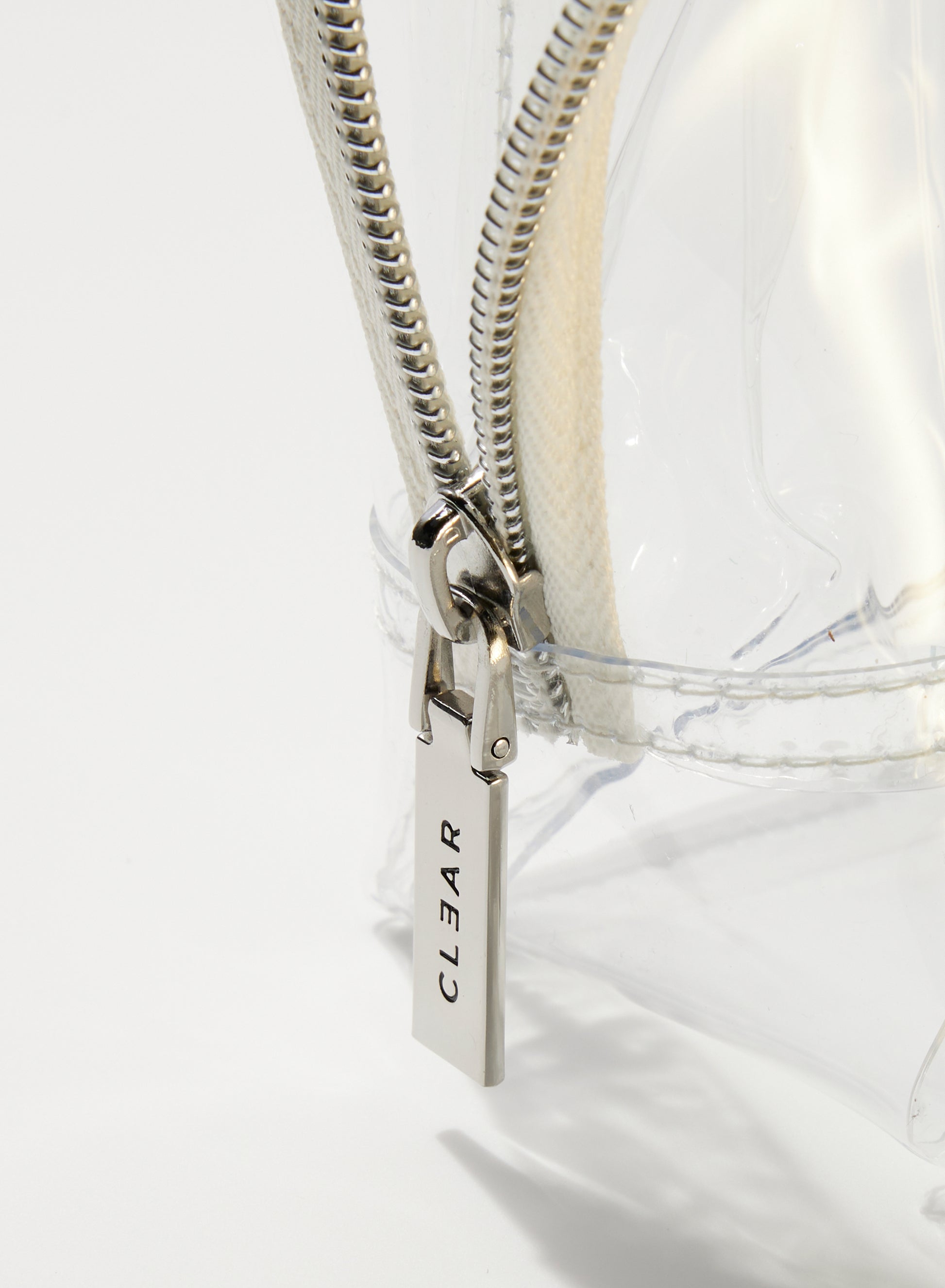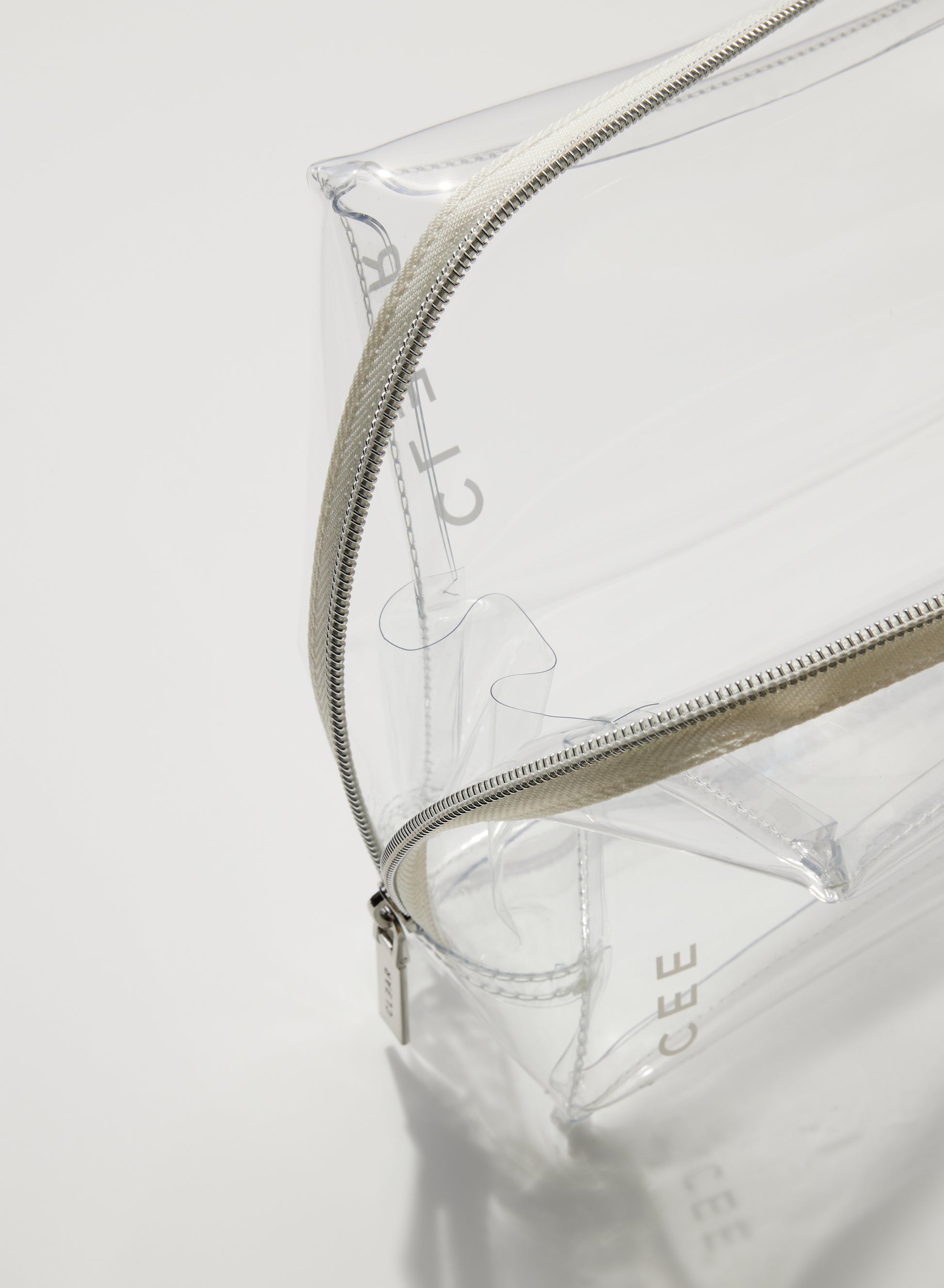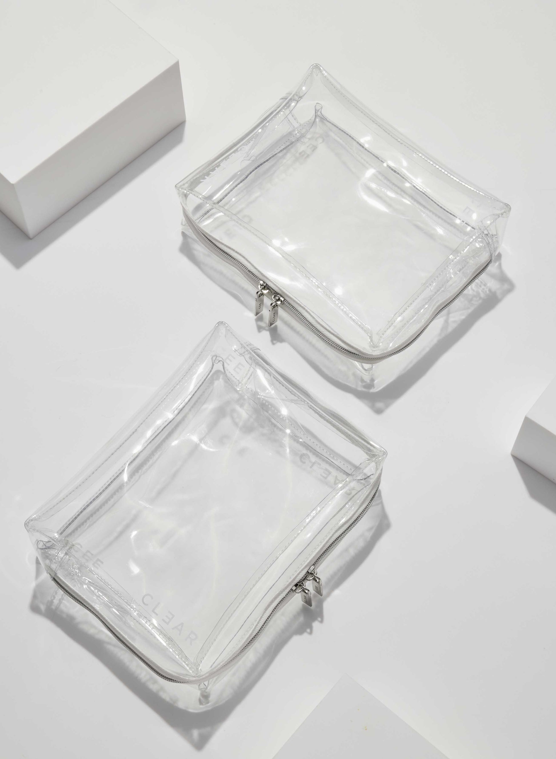 Transparent PVC cosmetic case. White piping. Double zip closure. Clear expandable design. Clear stitched detail.